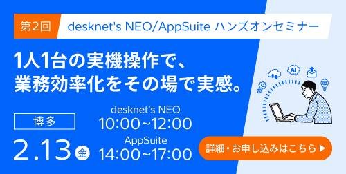 業種規模問わず幅広くお客さまにご利用いただいているグループウェアdesknet’s NEOのさまざまな機能を、1人1台のPCで実際に体験いただくハンズオンセミナーです。